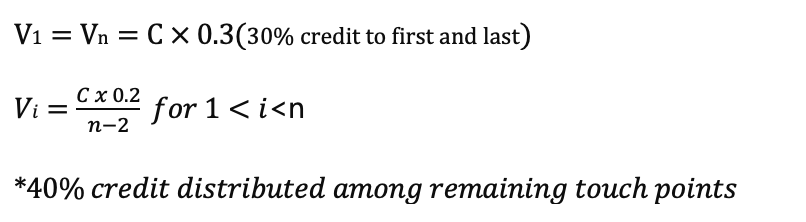 - Atrybucja oparta na pozycji (w kształcie litery U) kładzie nacisk na pierwszą i ostatnią interakcję (zwykle po 40%), a reszta jest rozłożona na inne punkty styku. Model ten może niedokładnie uchwycić znaczenie działań w połowie ścieżki i może nadmiernie upraszczać złożone podróże klientów. Większość kredytów trafia do pierwszego i ostatniego punktu styku, a reszta jest równomiernie rozłożona na środkowe punkty styku.