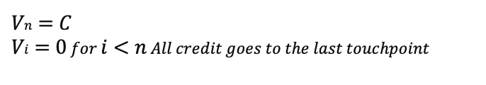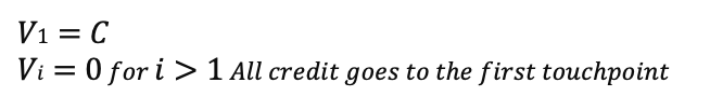 Proszę założyć, że mamy serię n punktów styku prowadzących do konwersji i proszę pozwolić C reprezentują całkowitą wartość konwersji. Wartość wkładu przypisana do każdego punktu styku i będzie oznaczane jako Vi. Poniżej przedstawiono różne tradycyjne modele atrybucji