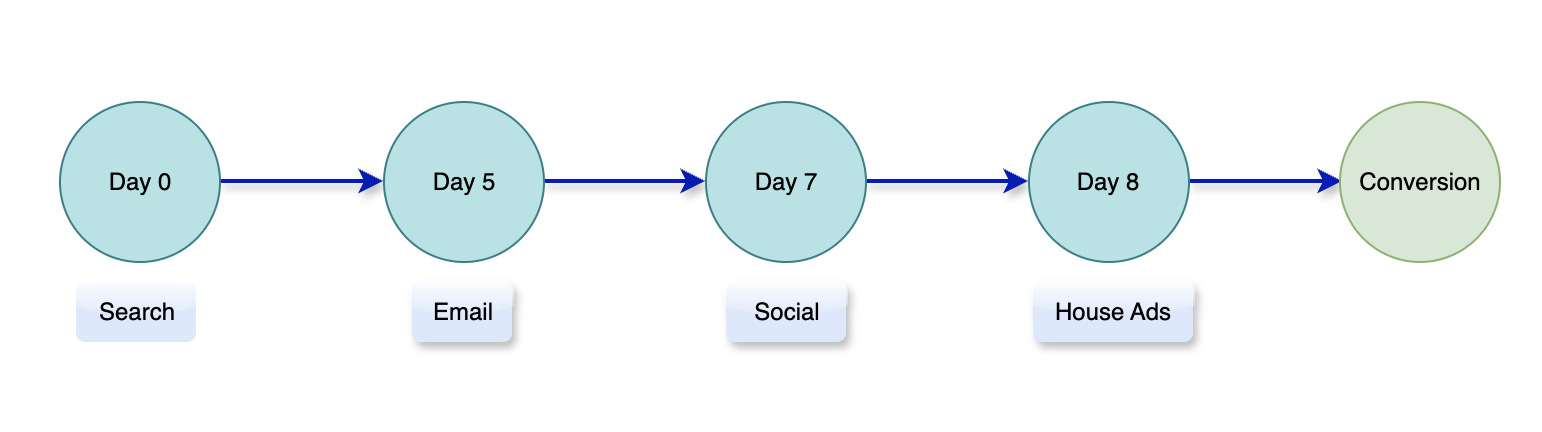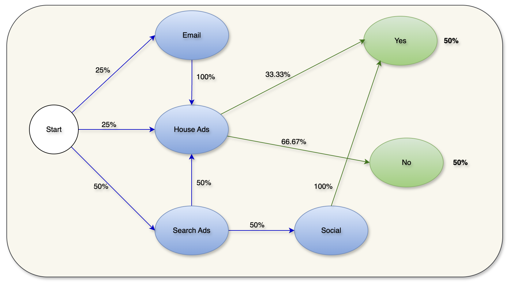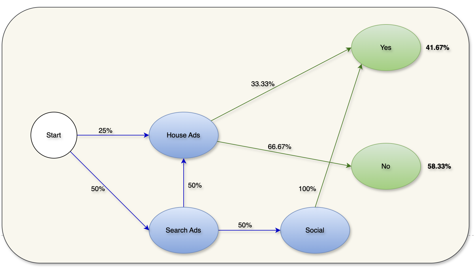 Przeanalizujmy Bayesian Multi-Touch Attribution w przykładzie podróży klienta obejmującym Reklamy displayowe, Szukaj reklam, Media społecznościowe, oraz Email Ads. Załóżmy, że mamy wcześniejsze przekonania (oparte na danych historycznych lub opiniach ekspertów) na temat skuteczności każdego kanału.