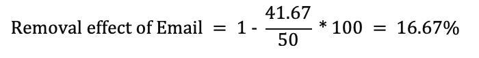 Po usunięciu wiadomości e-mail prawdopodobieństwo konwersji zmniejszyło się do 41,67% z 50%. Teraz efekt usunięcia kanału można obliczyć za pomocą poniższego wzoru: