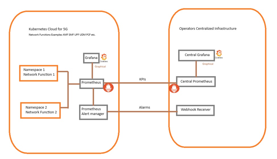 Narzędzia open-source OAM (Operation and Maintenance) Prometheus, Grafana i Alert Manager mogą przynieść korzyści operatorom 5G Telecom. Prometheus okresowo przechwytuje cały stan monitorowanych funkcji sieciowych 5G Telecom za pośrednictwem protokołu HTTP, a każdy komponent może być podłączony do monitorowania, o ile operator 5G Telecom zapewnia odpowiedni interfejs HTTP. Prometheus i Grafana Agent dają operatorowi 5G Telecom kontrolę nad metrykami, które operator chce raportować; gdy dane znajdą się w Grafanie, mogą być przechowywane w bazie danych Grafana jako dodatkowa redundancja danych.